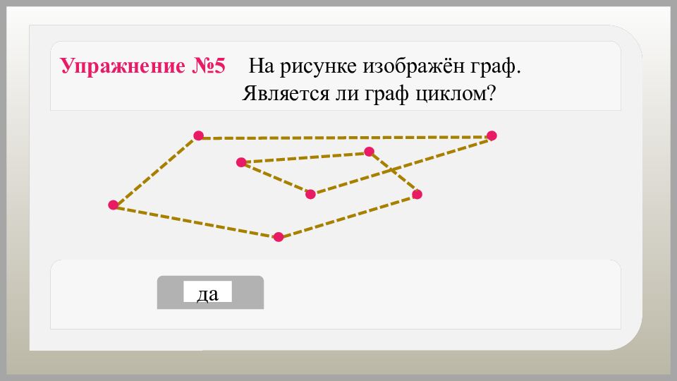 да нет Упражнение №5 На рисунке изображён граф. Является ли граф циклом?