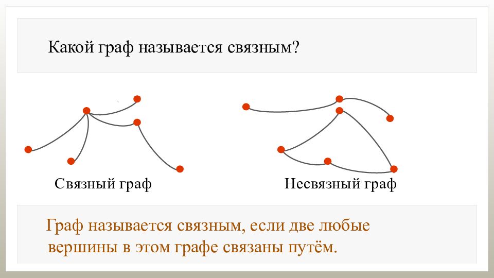 Какой граф называется связным? Граф называется связным, если две любые вершины в этом графе связаны путём.