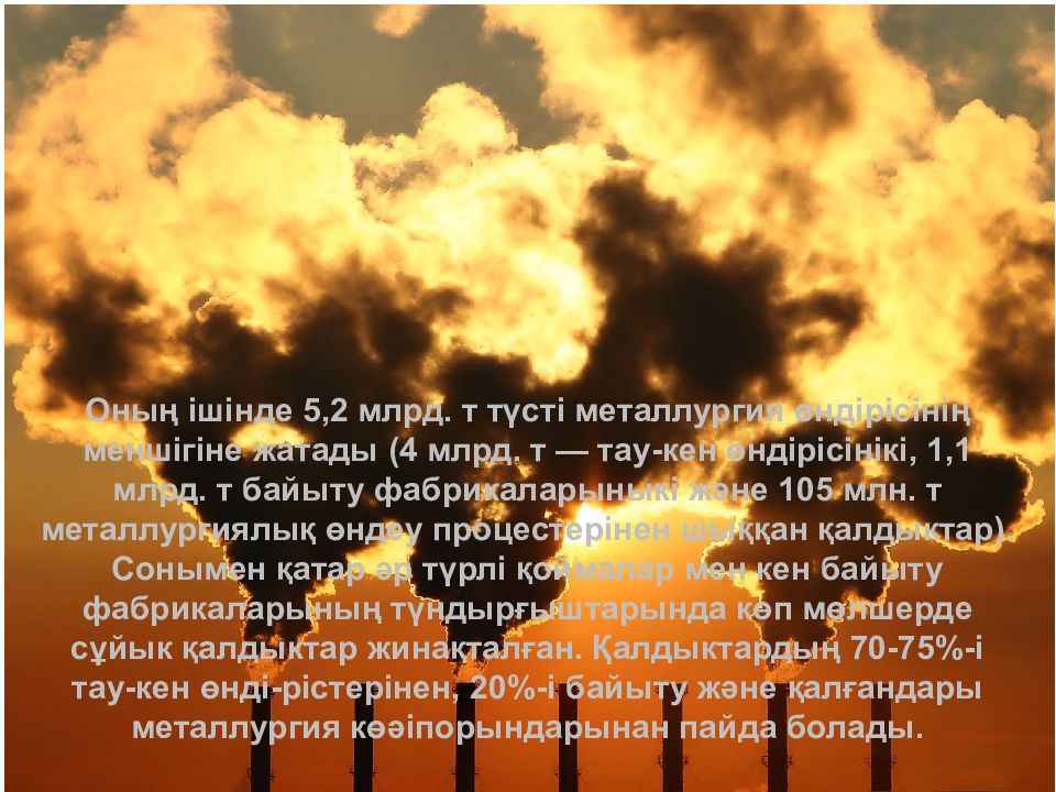 Оның ішінде 5,2 млрд. т түсті металлургия өндірісінің меншігіне жатады (4 млрд. т — тау- кен өндірісінікі, 1,1 млрд. т байыту фабрикаларыныкі және 105 млн. т металлургиялық өндеу процестерінен шыққан қалдыктар ). Сонымен қатар әр түрлі қоймалар мен кен байыту фабрикаларының түндырғыштарында көп мөлшерде сұйык қалдыктар жинақталған. Қалдыктардың 70-75%-і тау- кен өнді-рістерінен, 20%-і байыту және қалғандары металлургия көәіпорындарынан пайда болады.