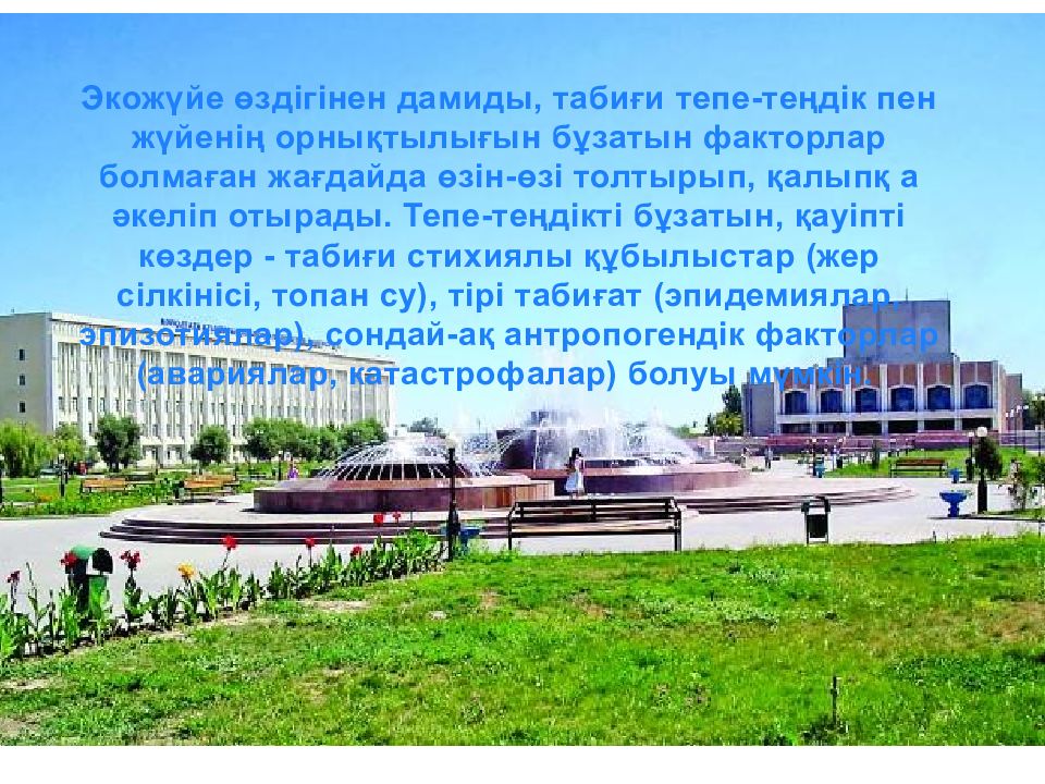 Экожүйе өздігінен дамиды, табиғи тепе- теңдік пен жүйенің орнықтылығын бұзатын факторлар болмаған жағдайда өзін-өзі толтырып, қалыпқ а әкеліп отырады. Тепе- теңдікті бұзатын, қауіпті көздер - табиғи стихиялы құбылыстар ( жер сілкінісі, топан су), тірі табиғат ( эпидемиялар, эпизотиялар ), сондай-ақ антропогендік факторлар ( авариялар, катастрофалар ) болуы мүмкін.