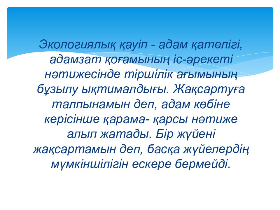 Экологиялық қауіп - адам қателігі, адамзат қоғамының іс-әрекеті нәтижесінде тіршілік ағымының бұзылу ықтималдығы. Жақсартуға талпынамын деп, адам көбіне керісінше қарама - қарсы нәтиже алып жатады. Бір жүйені жақсартамын деп, басқа жүйелердің мүмкіншілігін ескере бермейді.