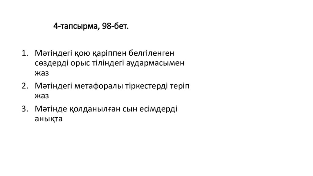 Мәтіндегі қою қаріппен белгіленген сөздерді орыс тіліндегі аудармасымен жаз Мәтіндегі метафоралы тіркестерді теріп жаз Мәтінде қолданылған сын есімдерді анықта