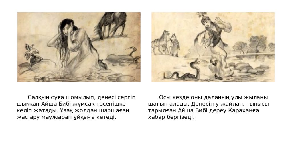 Салқын суға шомылып, денесі сергіп шыққан Айша Бибі жұмсақ төсенішке келіп жатады. Ұзақ жолдан шаршаған жас ару маужырап ұйқыға кетеді. Осы кезде оны даланың улы жыланы шағып алады. Денесін у жайлап, тынысы тарылған Айша Бибі дереу Қараханға хабар бергізеді.