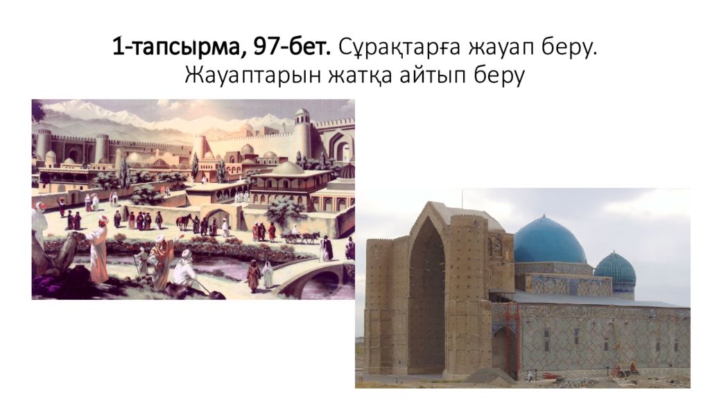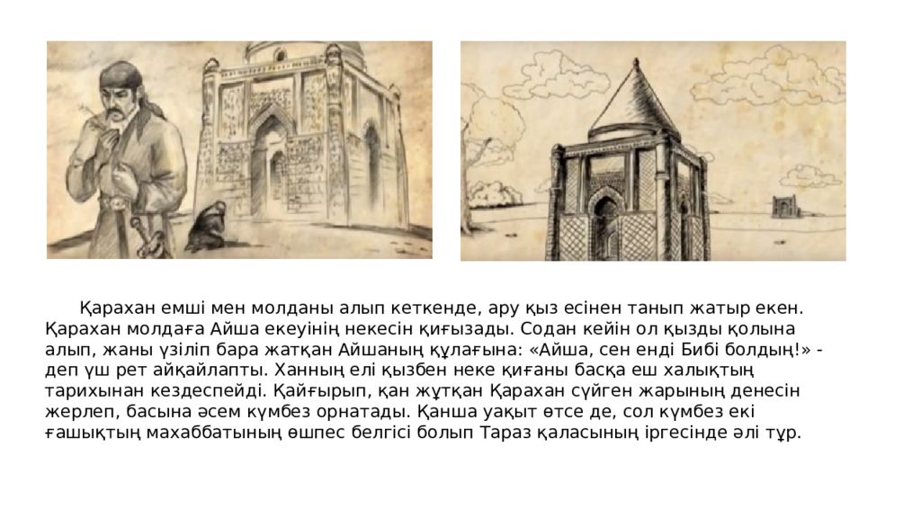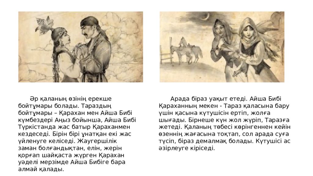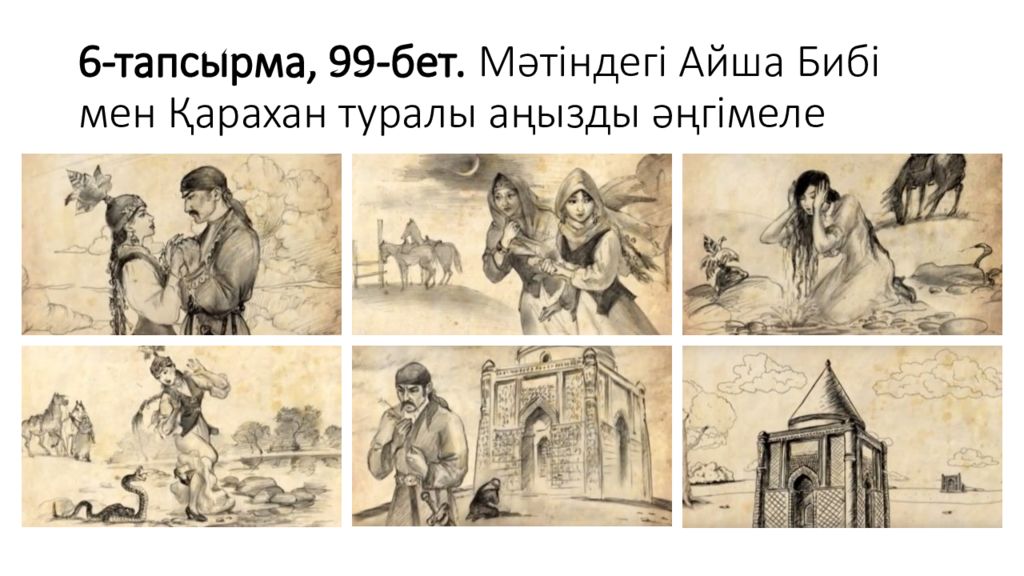 Слайд 12: 6-тапсырма, 99-бет. Мәтіндегі Айша Бибі мен Қарахан туралы аңызды әңгімеле