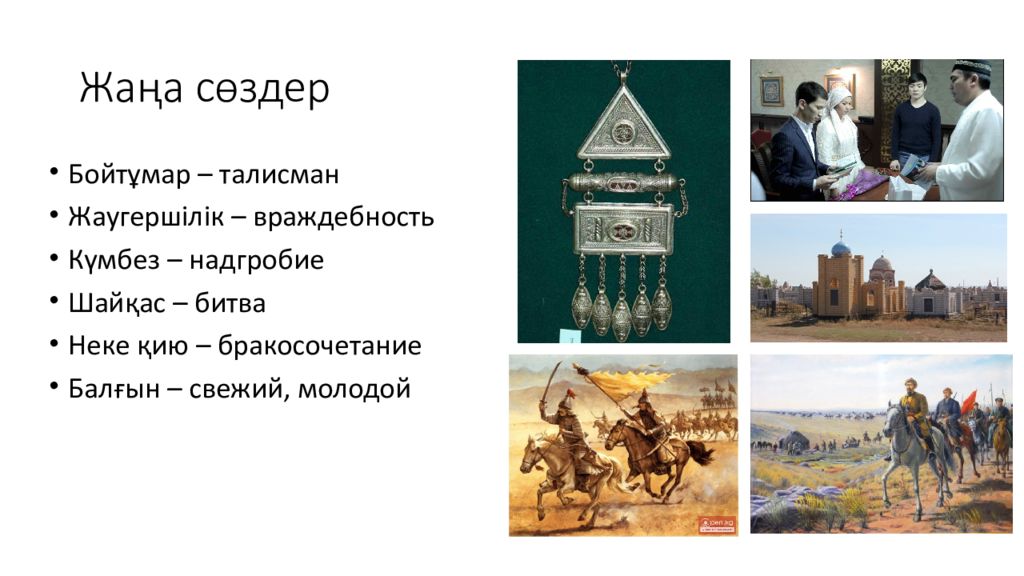 Бойтұмар – талисман Жаугершілік – враждебность Күмбез – надгробие Шайқас – битва Неке қию – бракосочетание Балғын – свежий, молодой Жаңа сөздер