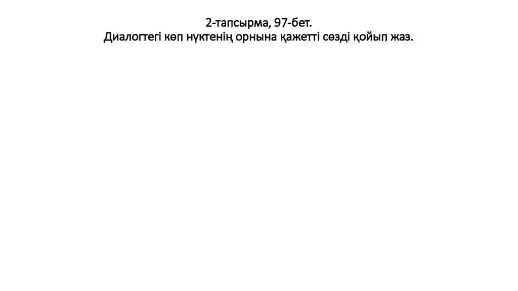Слайд 5: 2-тапсырма, 97-бет. Диалогтегі көп нүктенің орнына қажетті сөзді қойып жаз