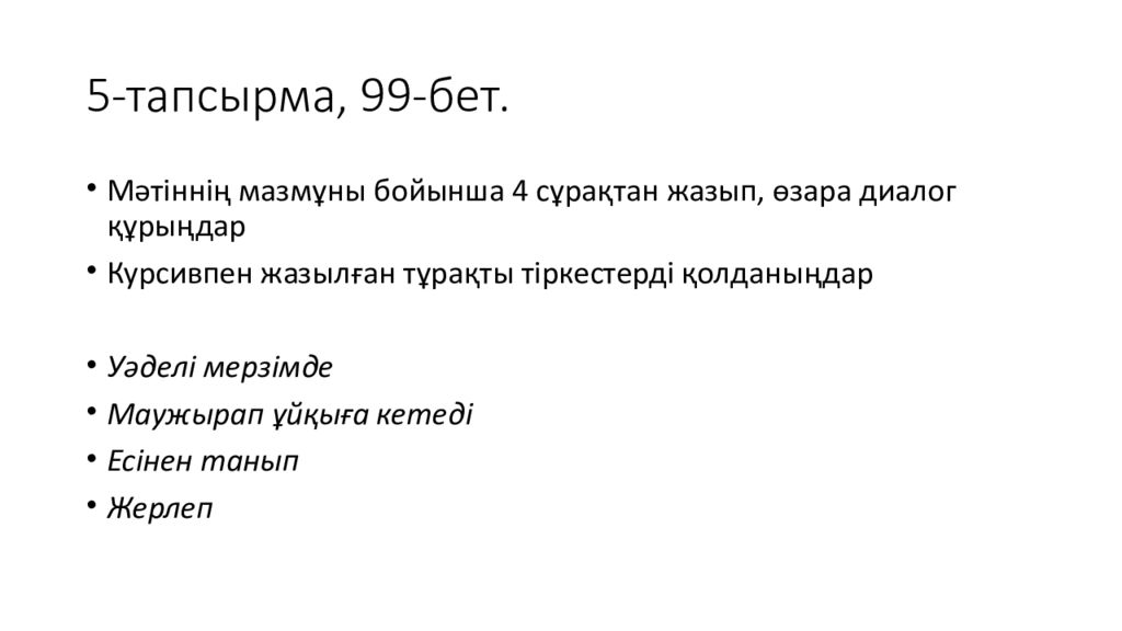 Мәтіннің мазмұны бойынша 4 сұрақтан жазып, өзара диалог құрыңдар Курсивпен жазылған тұрақты тіркестерді қолданыңдар Уәделі мерзімде Маужырап ұйқыға кетеді Есінен танып Жерлеп