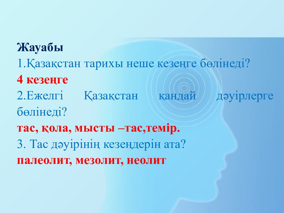 Жауабы 1.Қазақстан тарихы неше кезеңге бөлінеді? 4 кезеңге 2.Ежелгі Қазақстан қандай дәуірлерге бөлінеді? тас, қола, мысты – тас, темір. 3. Тас дәуірінің кезеңдерін ата? палеолит, мезолит, неолит