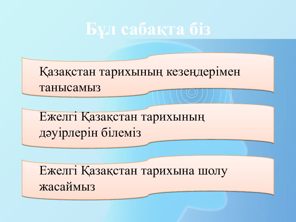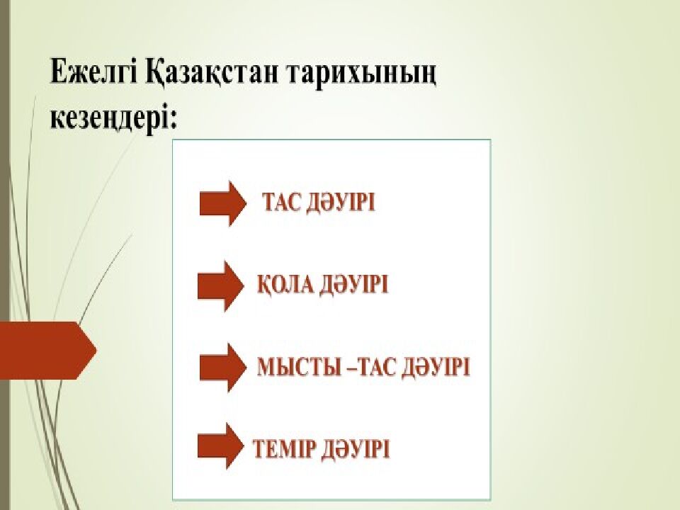 Қазақстан тарихының кезеңдерімен танысамыз Ежелгі Қазақстан тарихының дәуірлерін білеміз Ежелгі Қазақстан тарихына шолу жасаймыз