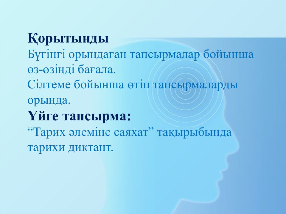 Қорытынды Бүгінгі орындаған тапсырмалар бойынша өз-өзіңді бағала. Сілтеме бойынша өтіп тапсырмаларды орында. Үйге тапсырма: “Тарих әлеміне саяхат” тақырыбында тарихи диктант.