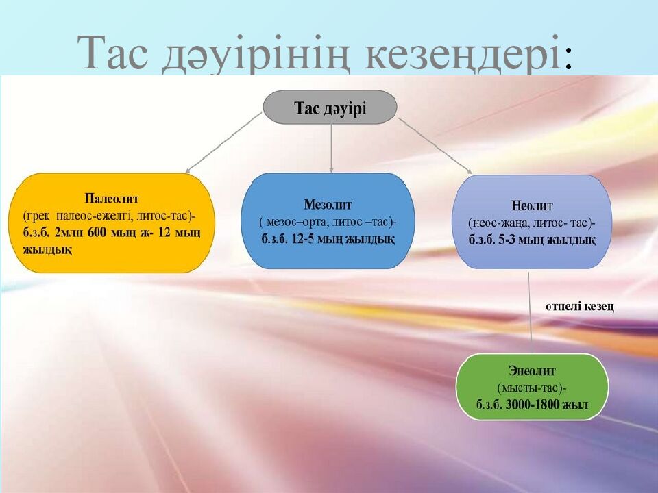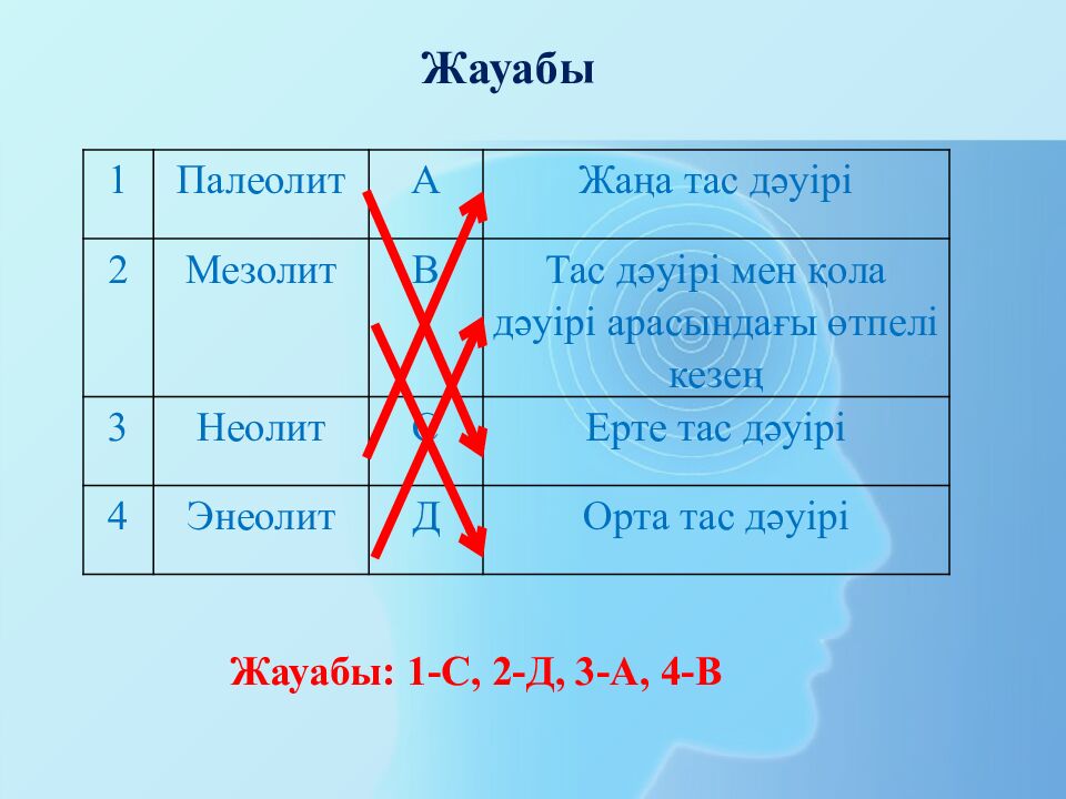 1 Палеолит А Жаңа тас дәуірі 2 Мезолит В Тас дәуірі мен қола дәуірі арасындағы өтпелі кезең 3 Неолит С Ерте тас дәуірі 4 Энеолит Д Орта тас дәуірі Жауабы Жауабы: 1-С, 2-Д, 3-А, 4-В