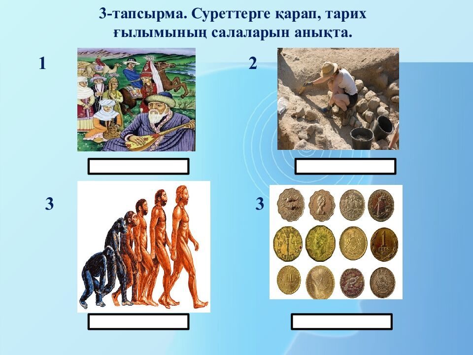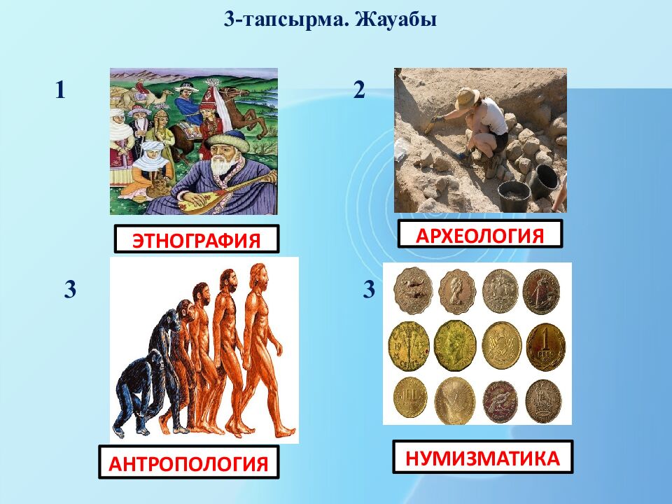 3-тапсырма. Жауабы 1 2 3 3 ЭТНОГРАФИЯ АРХЕОЛОГИЯ АНТРОПОЛОГИЯ НУМИЗМАТИКА
