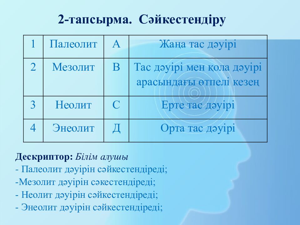1 Палеолит А Жаңа тас дәуірі 2 Мезолит В Тас дәуірі мен қола дәуірі арасындағы өтпелі кезең 3 Неолит С Ерте тас дәуірі 4 Энеолит Д Орта тас дәуірі 2-тапсырма. Сәйкестендіру Дескриптор: Білім алушы - Палеолит дәуірін сәйкестендіреді; -Мезолит дәуірін сәкестендіреді; - Неолит дәуірін сәйкестендіреді; - Энеолит дәуірін сәйкестендіреді;