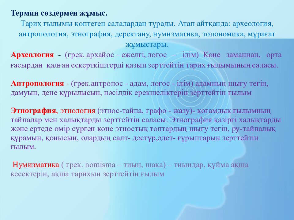 Термин сөздермен жұмыс. Тарих ғылымы көптеген салалардан тұрады. Атап айтқанда: археология, антропология, этнография, деректану, нумизматика, топономика, мұрағат жұмыстары. Археология - (грек. архайос – ежелгі, логос – ілім) Көне заманнан, орта ғасырдан қалған ескерткіштерді қазып зерттейтін тарих ғылымының саласы. Антропология - (грек.антропос - адам, логос - ілім) адамның шығу тегін, дамуын, дене құрылысын, нәсілдік ерекшеліктерін зерттейтін ғылым Этнография, этнология (этнос-тайпа, графо - жазу)- қоғамдық ғылымның тайпалар мен халықтарды зерттейтін саласы. Этнография қазіргі халықтарды және ертеде өмір сүрген көне этностық топтардың шығу тегін, ру-тайпалық құрамын, қонысын, олардың салт- дәстүр,әдет- ғұрыптарын зерттейтін ғылым. Нумизматика ( грек. nom і sma – тиын, шақа) – тиындар, құйма ақша кесектерін, ақша тарихын зерттейтін ғылым