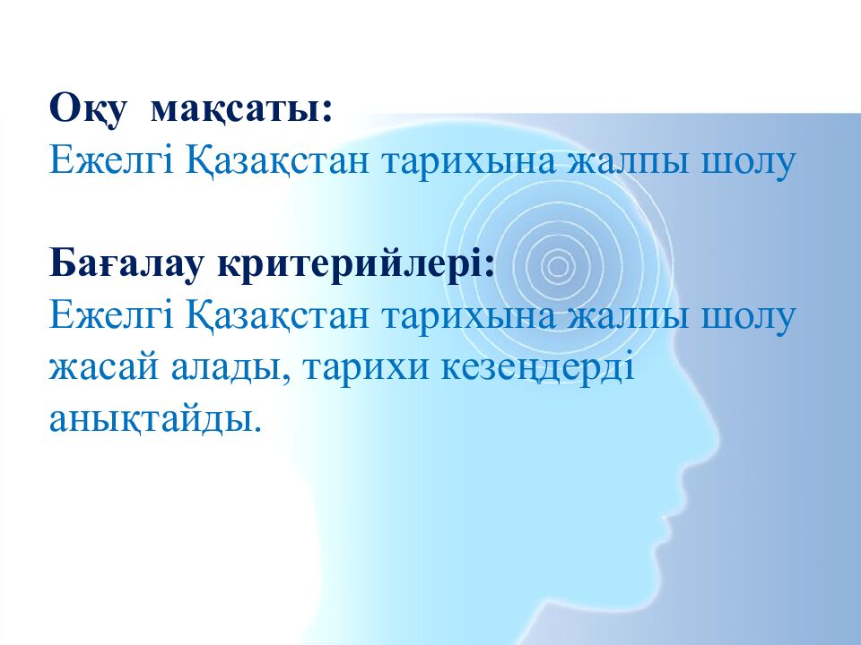 Оқу мақсаты: Ежелгі Қазақстан тарихына жалпы шолу Бағалау критерийлері: Ежелгі Қазақстан тарихына жалпы шолу жасай алады, тарихи кезеңдерді анықтайды.