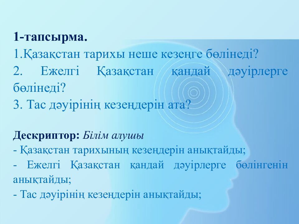 1-тапсырма. 1.Қазақстан тарихы неше кезеңге бөлінеді? 2. Ежелгі Қазақстан қандай дәуірлерге бөлінеді? 3. Тас дәуірінің кезеңдерін ата? Дескриптор: Білім алушы - Қазақстан тарихының кезеңдерін анықтайды; - Ежелгі Қазақстан қандай дәуірлерге бөлінгенін анықтайды; - Тас дәуірінің кезеңдерін анықтайды;
