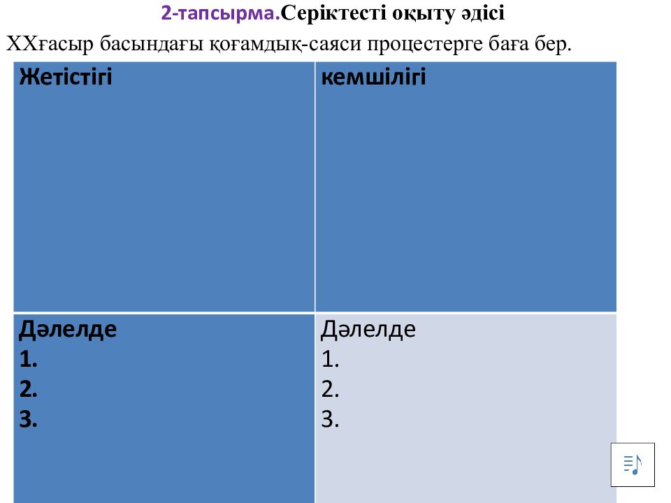 2-тапсырма. Серіктесті оқыту әдісі ХХғасыр басындағы қоғамдық-саяси процестерге баға бер. Жетістігі кемшілігі Дәлелде 1. 2. 3. Дәлелде 1. 2. 3.
