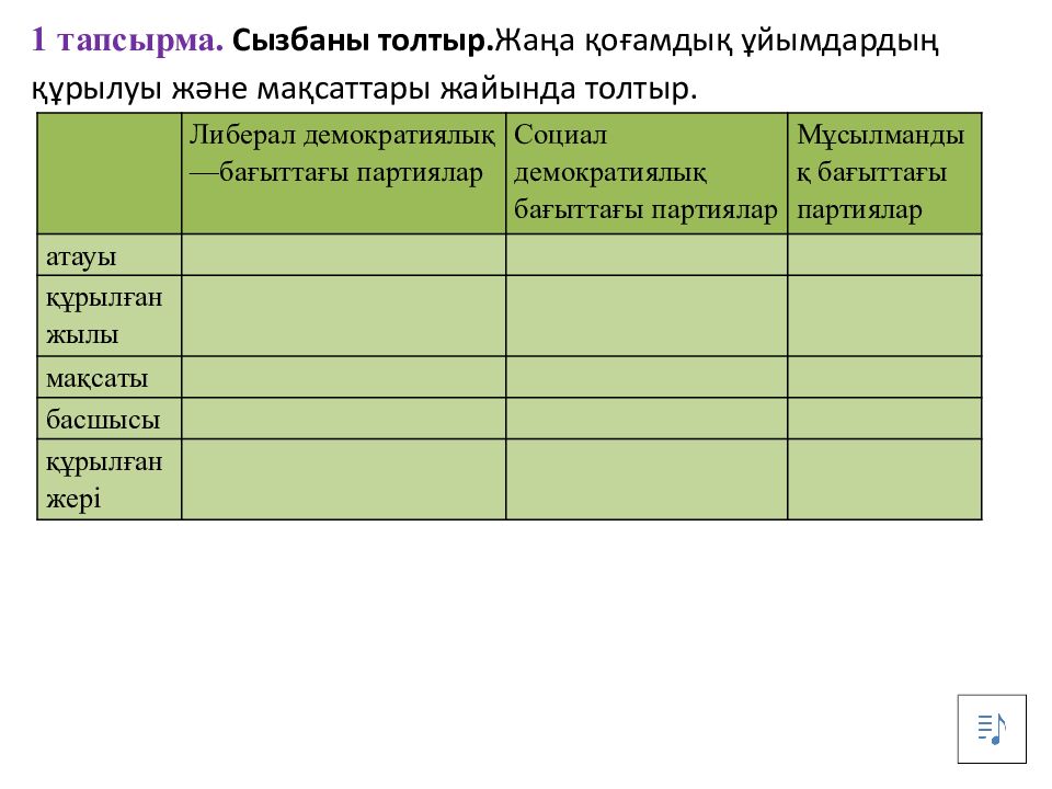 1 тапсырма. Сызбаны толтыр. Жаңа қоғамдық ұйымдардың құрылуы және мақсаттары жайында толтыр. Либерал демократиялық—бағыттағы партиялар Социал демократиялық бағыттағы партиялар Мұсылмандық бағыттағы партиялар атауы құрылған жылы мақсаты басшысы құрылған жері