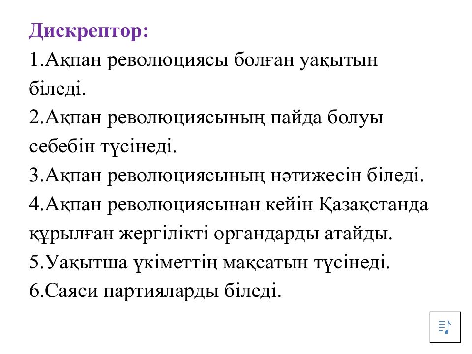 Дискрептор: 1.Ақпан революциясы болған уақытын біледі. 2.Ақпан революциясының пайда болуы себебін түсінеді. 3.Ақпан революциясының нәтижесін біледі. 4.Ақпан революциясынан кейін Қазақстанда құрылған жергілікті органдарды атайды. 5.Уақытша үкіметтің мақсатын түсінеді. 6.Саяси партияларды біледі.