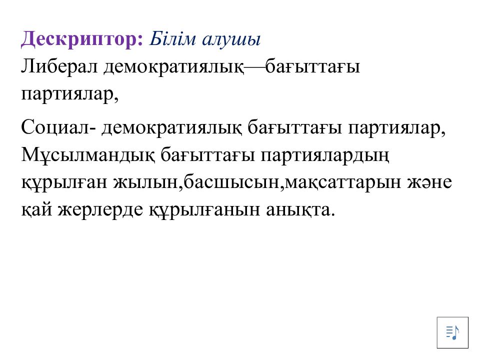 Дескриптор : Білім алушы Либерал демократиялық—бағыттағы партиялар, Социал- демократиялық бағыттағы партиялар, Мұсылмандық бағыттағы партиялардың құрылған жылын,басшысын,мақсаттарын және қай жерлерде құрылғанын анықта.