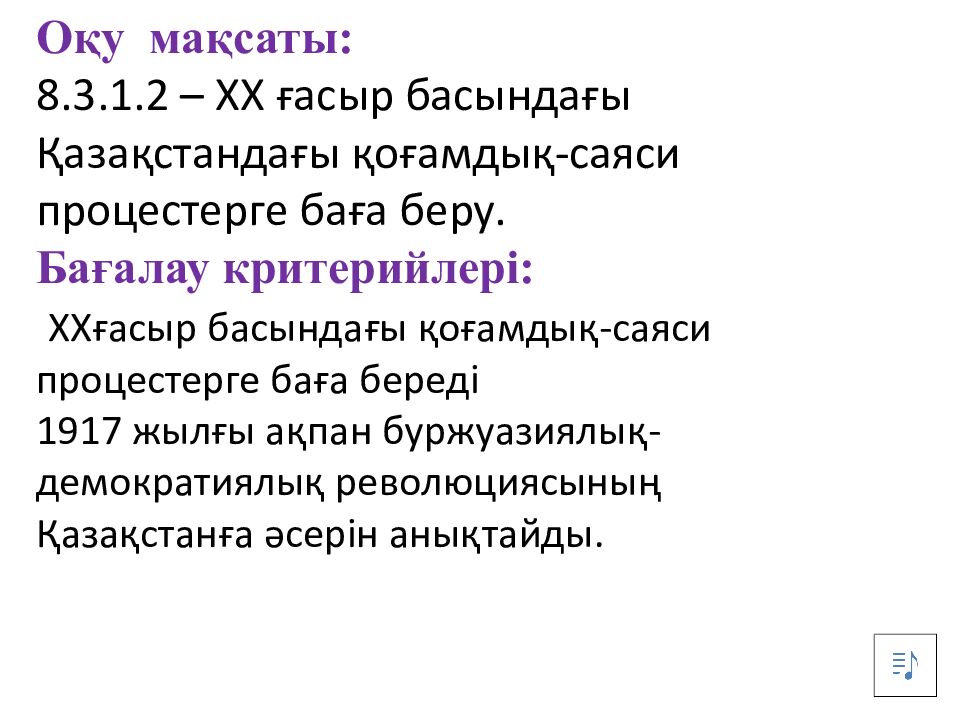 Оқу мақсаты : 8.3.1.2 – XX ғасыр басындағы Қазақстандағы қоғамдық-саяси процестерге баға беру. Бағалау критерийлері: ХХғасыр басындағы қоғамдық-саяси процестерге баға береді 1917 жылғы ақпан буржуазиялық-демократиялық революциясының Қазақстанға әсерін анықтайды.