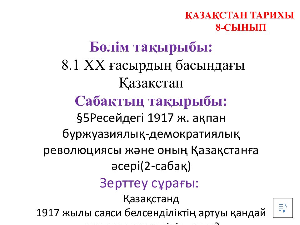 ҚАЗАҚСТАН ТАРИХЫ 8-СЫНЫП Бөлім тақырыбы: 8.1 ХХ ғасырдың басындағы Қазақстан Сабақтың тақырыбы: §5Ресейдегі 1917 ж. ақпан буржуазиялық-демократиялық революциясы және оның Қазақстанға әсері(2-сабақ) Зерттеу сұрағы: Қазақстанд 1917 жылы саяси белсенділіктің артуы қандай оқиғалардан көрініс тапты?