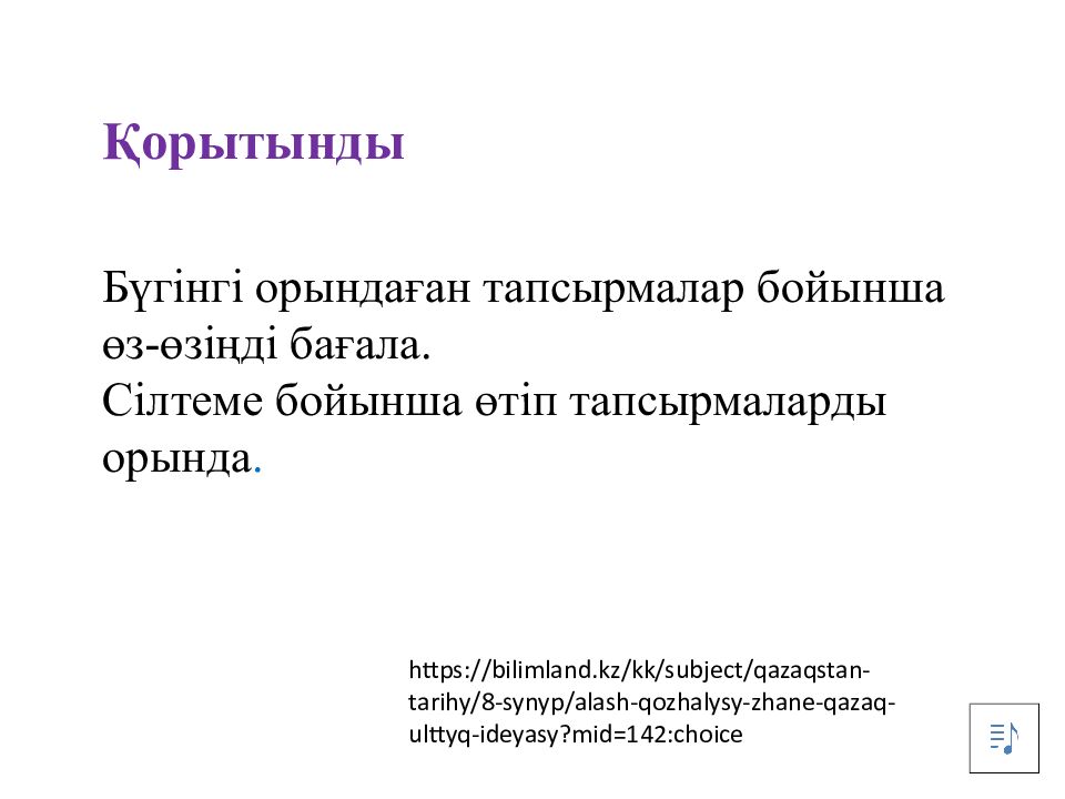 Қорытынды Бүгінгі орындаған тапсырмалар бойынша өз-өзіңді бағала. Сілтеме бойынша өтіп тапсырмаларды орында. https ://bilimland.kz/kk/subject/qazaqstan-tarihy/8-synyp/alash-qozhalysy-zhane-qazaq-ulttyq-ideyasy?mid=142:choice