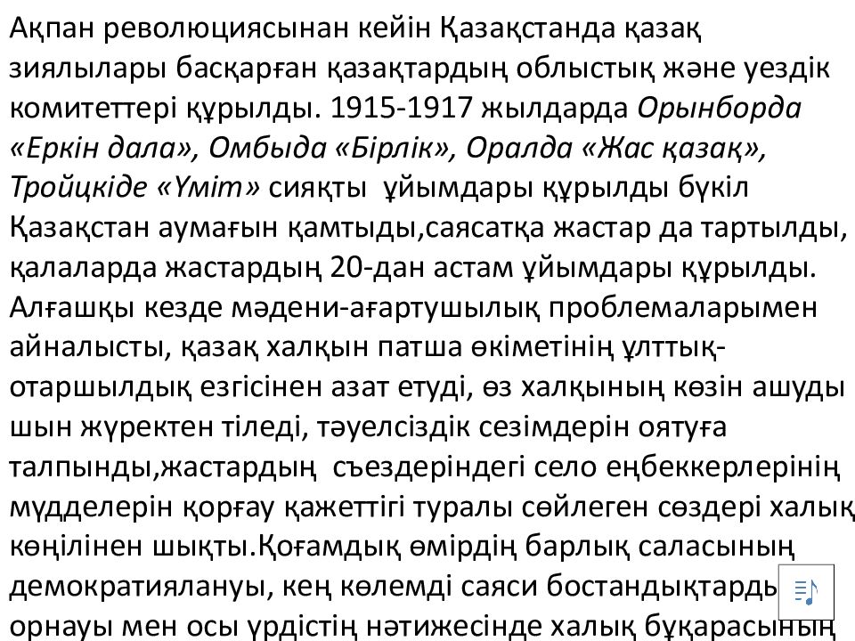Ақпан революциясынан кейін Қазақстанда қазақ зиялылары басқарған қазақтардың облыстық және уездік комитеттері құрылды. 1915-1917 жылдарда Орынборда « Еркін дала», Омбыда « Бірлік », Оралда « Жас қазақ », Тройцкіде « Үміт » сияқты ұйымдары құрылды бүкіл Қазақстан аумағын қамтыды, саясатқа жастар да тартылды, қалаларда жастардың 20-дан астам ұйымдары құрылды. Алғашқы кезде мәдени-ағартушылық проблемаларымен айналысты, қазақ халқын патша өкіметінің ұлттық-отаршылдық езгісінен азат етуді, өз халқының көзін ашуды шын жүректен тіледі, тәуелсіздік сезімдерін оятуға талпынды,жастардың съездеріндегі село еңбеккерлерінің мүдделерін қорғау қажеттігі туралы сөйлеген сөздері халық көңілінен шықты.Қоғамдық өмірдің барлық саласының демократиялануы, кең көлемді саяси бостандықтардың орнауы мен осы үрдістің нәтижесінде халық бұқарасының саяси санасының арты.