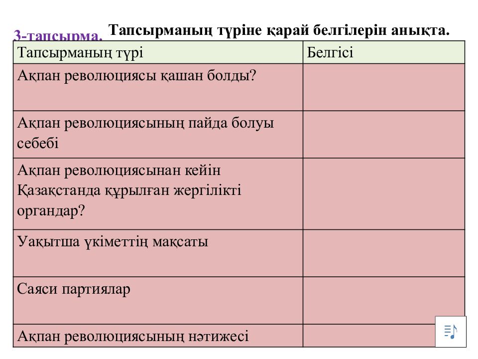 3-тапсырма. Тапсырманың түріне қарай белгілерін анықта. Тапсырманың түрі Белгісі Ақпан революциясы қашан болды? Ақпан революциясының пайда болуы себебі Ақпан революциясынан кейін Қазақстанда құрылған жергілікті органдар? Уақытша үкіметтің мақсаты Саяси партиялар Ақпан революциясының нәтижесі