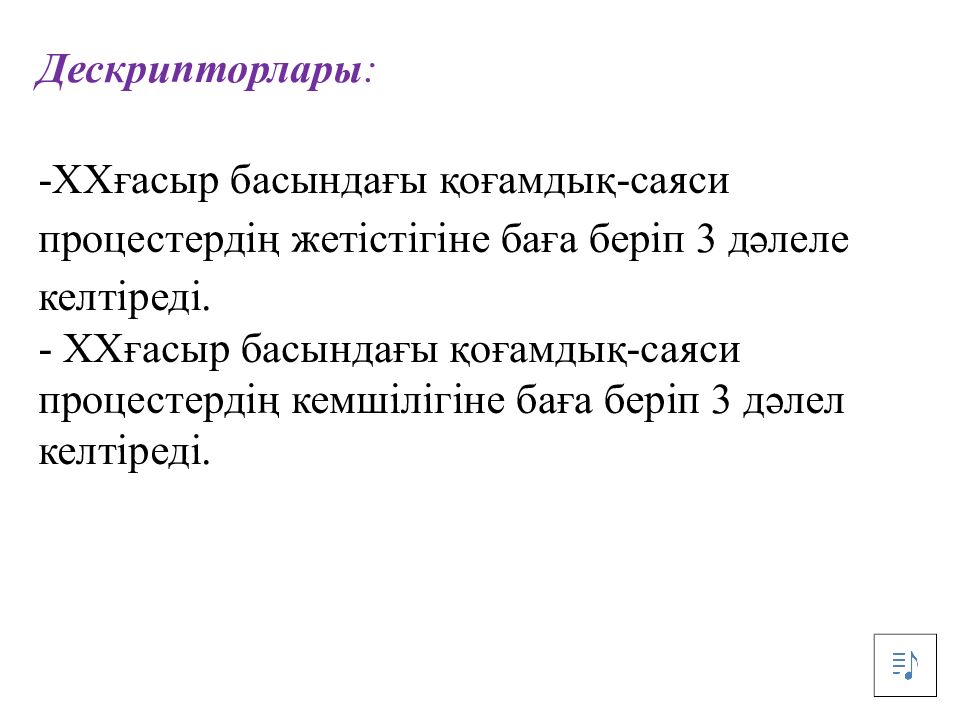 Дескрипторлары : -ХХғасыр басындағы қоғамдық-саяси процестердің жетістігіне баға беріп 3 дәлеле келтіреді. - ХХғасыр басындағы қоғамдық-саяси процестердің кемшілігіне баға беріп 3 дәлел келтіреді.