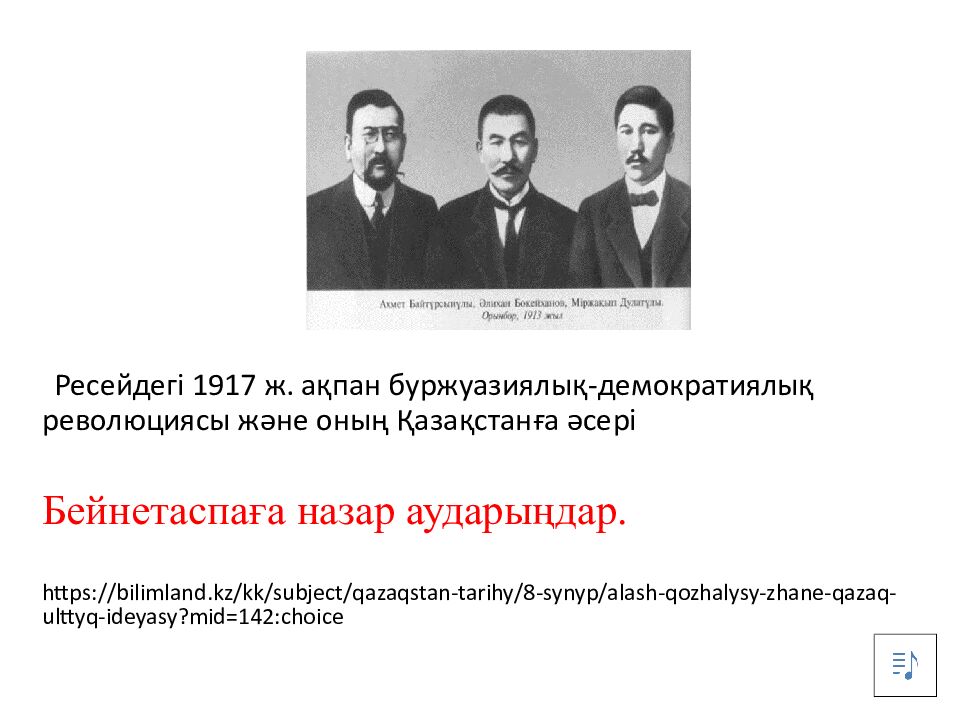 Ресейдегі 1917 ж. ақпан буржуазиялық-демократиялық революциясы және оның Қазақстанға әсері Бейнетаспаға назар аударыңдар. https://bilimland.kz/kk/subject/qazaqstan-tarihy/8-synyp/alash-qozhalysy-zhane-qazaq-ulttyq-ideyasy?mid=142:choice