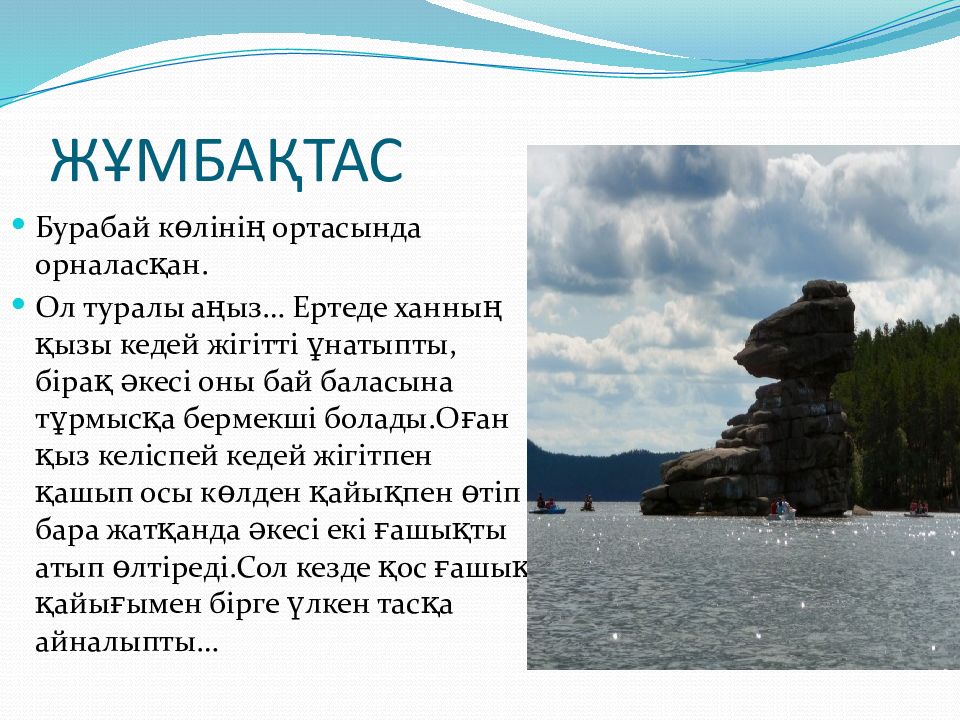 Бурабай көлінің ортасында орналасқан. Ол туралы аңыз … Ертеде ханның қызы кедей жігітті ұнатыпты, бірақ әкесі оны бай баласына тұрмысқа бермекші болады.Оған қыз келіспей кедей жігітпен қашып осы көлден қайықпен өтіп бара жатқанда әкесі екі ғашықты атып өлтіреді.Сол кезде қос ғашық қайығымен бірге үлкен тасқа айналыпты …