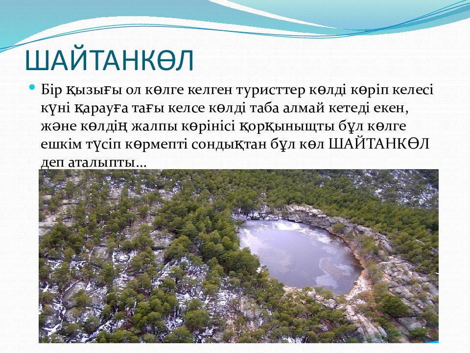 Бір қызығы ол көлге келген туристтер көлді көріп келесі күні қарауға тағы келсе көлді таба алмай кетеді екен, және көлдің жалпы көрінісі қорқыныщты бұл көлге ешкім түсіп көрмепті сондықтан бұл көл ШАЙТАНКӨЛ деп аталыпты …
