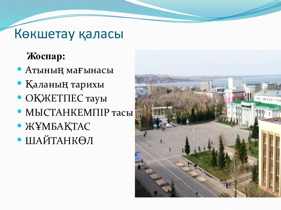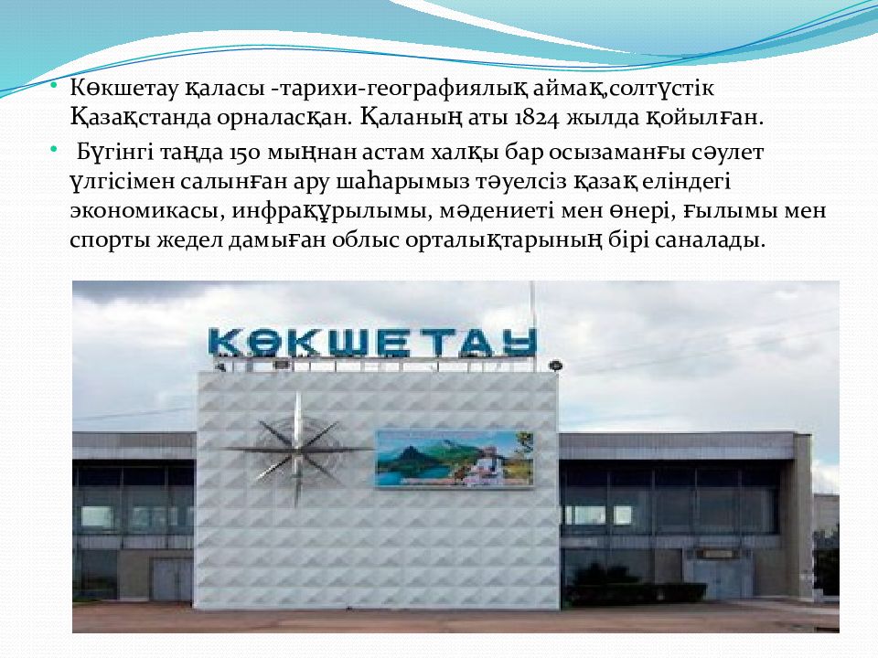 Көкшетау қаласы - тарихи-географиялық аймақ,солтүст i к Қазақстанда орнала сқан. Қаланың аты 1824 жылда қойылған. Бүгінгі таңда 150 мыңнан астам халқы бар осызаманғы сәулет үлгісімен салынған ару шаһарымыз тәуелсіз қазақ еліндегі экономикасы, инфрақұрылымы, мәдениеті мен өнері, ғылымы мен спорты жедел дамыған облыс орталықтарының бірі саналады.