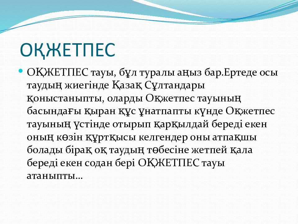 ОҚЖЕТПЕС тауы, бұл туралы аңыз бар.Ертеде осы таудың жиегінде Қазақ Сұлтандары қоныстаныпты, оларды Оқжетпес тауының басындағы қыран құс ұнатпапты күнде Оқжетпес тауының үстінде отырып қарқылдай береді екен оның көзін құртқысы келгендер оны атпақшы болады бірақ оқ таудың төбесіне жетпей қала береді екен содан бері ОҚЖЕТПЕС тауы атаныпты …