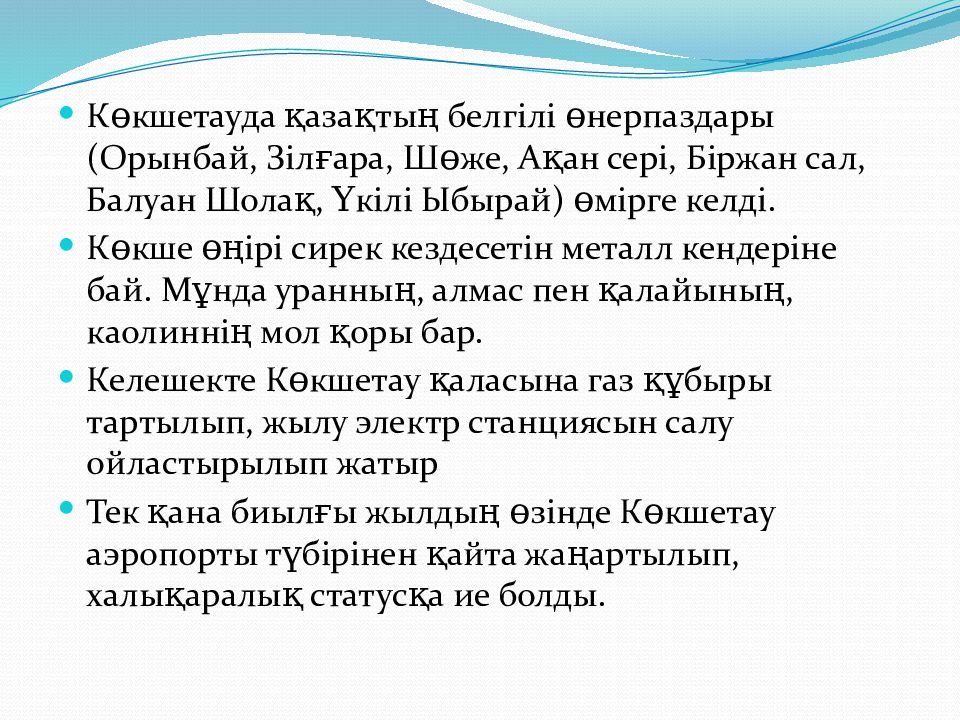 Көкшетауда қазақтың белгілі өнерпаздары ( Орынбай, Зілғара, Шөже, Ақан сері, Біржан сал, Балуан Шолақ, Үкілі Ыбырай ) өмірге келді. Көкше өңірі сирек кездесетін металл кендеріне бай. Мұнда уранның, алмас пен қалайының, каолиннің мол қоры бар. Келешекте Көкшетау қаласына газ құбыры тартылып, жылу электр станциясын салу ойластырылып жатыр Тек қана биылғы жылдың өзінде Көкшетау аэропорты түбірінен қайта жаңартылып, халықаралық статусқа ие болды.