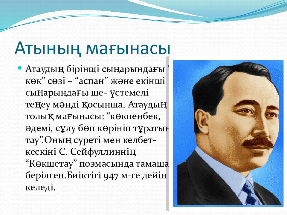 Атаудың б i р i нщ i сыңарындағы “ көк ” сөз i – “ аспан ” және ек i нш i сыңарындағы ше - үстемел i теңеу мәнд i қосынша. Атаудың толық мағынасы : “ көкпенбек, әдем i, сұлу бөп көр i н i п тұратын тау”. Оның сурет i мен келбет - кеск i н i С. Сейфуллинн i ң “ Көкшетау ” поэмасында тамаша бер i лген.Би i кт i г i 947 м- ге дей i н келед i.