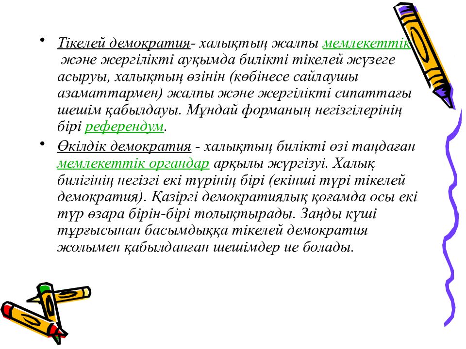 Тікелей демократия - халықтың жалпы мемлекеттік және жергілікті ауқымда билікті тікелей жүзеге асыруы, халықтың өзінін (көбінесе сайлаушы азаматтармен) жалпы және жергілікті сипаттағы шешім қабылдауы. Мұндай форманың негізгілерінің бірі референдум. Өкілдік демократия - халықтың билікті өзі таңдаған мемлекеттік органдар арқылы жүргізуі. Халық билігінің негізгі екі түрінің бірі (екінші түрі тікелей демократия). Қазіргі демократиялық қоғамда осы екі түр өзара бірін-бірі толықтырады. Заңды күші тұрғысынан басымдыққа тікелей демократия жолымен қабылданған шешімдер ие болады.