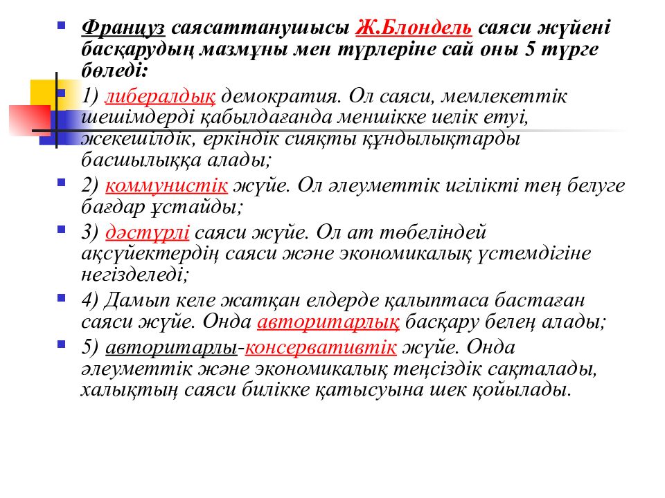 Француз саясаттанушысы Ж.Блондель саяси жүйені басқарудың мазмұны мен түрлеріне сай оны 5 түрге бөледі: 1) либералдық демократия. Ол саяси, мемлекеттік шешімдерді қабылдағанда меншікке иелік етуі, жекешілдік, еркіндік сияқты құндылықтарды басшылыққа алады; 2) коммунистік жүйе. Ол әлеуметтік игілікті тең белуге бағдар ұстайды; 3) дәстүрлі саяси жүйе. Ол ат төбеліндей ақсүйектердің саяси және экономикалық үстемдігіне негізделеді; 4) Дамып келе жатқан елдерде қалыптаса бастаған саяси жүйе. Онда авторитарлық басқару белең алады; 5) авторитарлы - консервативтік жүйе. Онда әлеуметтік және экономикалық теңсіздік сақталады, халықтың саяси билікке қатысуына шек қойылады.