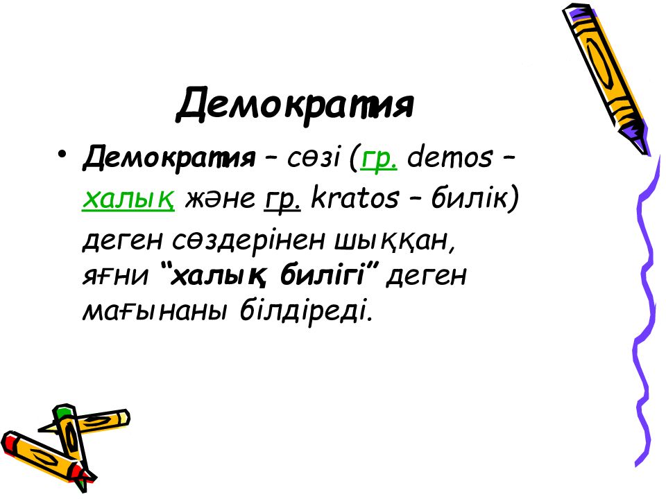 Демократия – сөзі ( гр. demos – халық және гр. kratos – билік) деген сөздерінен шыққан, яғни “халық билігі” деген мағынаны білдіреді.