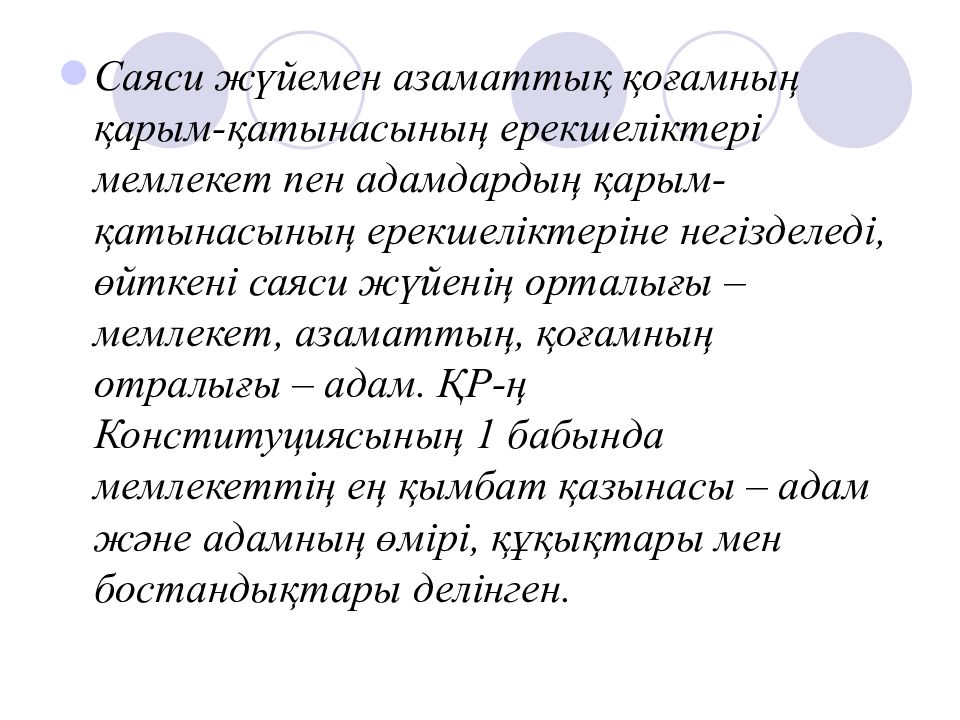 Саяси жүйемен азаматтық қоғамның қарым-қатынасының ерекшеліктері мемлекет пен адамдардың қарым-қатынасының ерекшеліктеріне негізделеді, өйткені саяси жүйенің орталығы – мемлекет, азаматтың, қоғамның отралығы – адам. ҚР-ң Конституциясының 1 бабында мемлекеттің ең қымбат қазынасы – адам және адамның өмірі, құқықтары мен бостандықтары делінген.