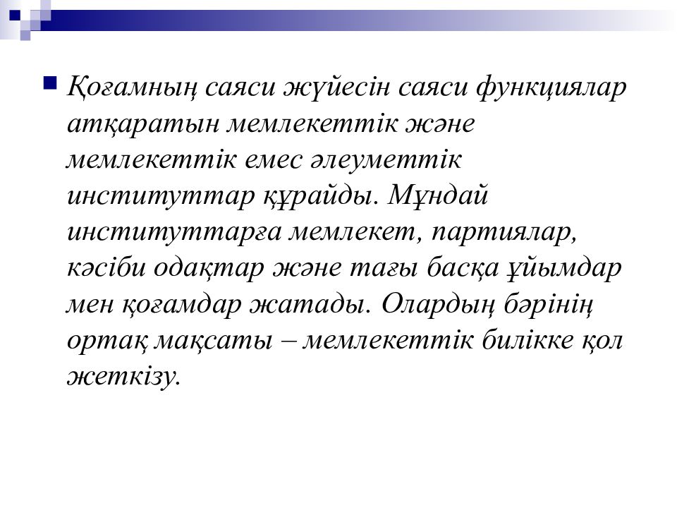 Қоғамның саяси жүйесін саяси функциялар атқаратын мемлекеттік және мемлекеттік емес әлеуметтік институттар құрайды. Мұндай институттарға мемлекет, партиялар, кәсіби одақтар және тағы басқа ұйымдар мен қоғамдар жатады. Олардың бәрінің ортақ мақсаты – мемлекеттік билікке қол жеткізу.