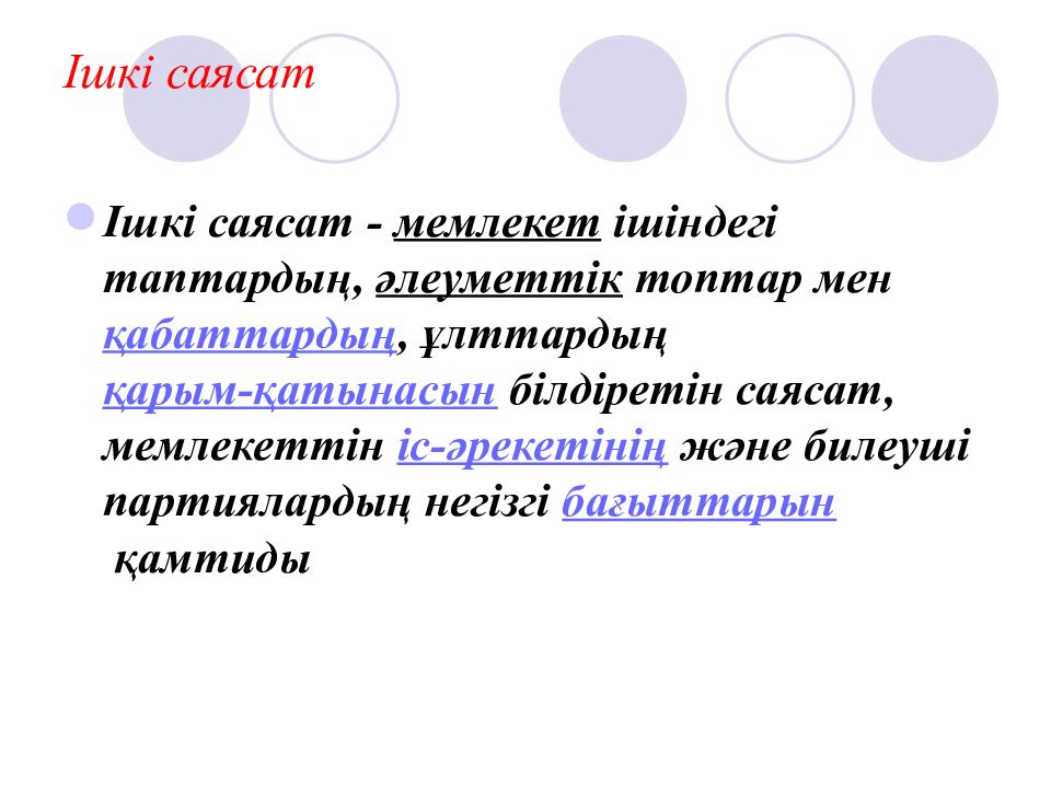Ішкі саясат - мемлекет ішіндегі таптардың, әлеуметтік топтар мен қабаттардың, ұлттардың қарым-қатынасын білдіретін саясат, мемлекеттін іс-әрекетінің және билеуші партиялардың негізгі бағыттарын қамтиды
