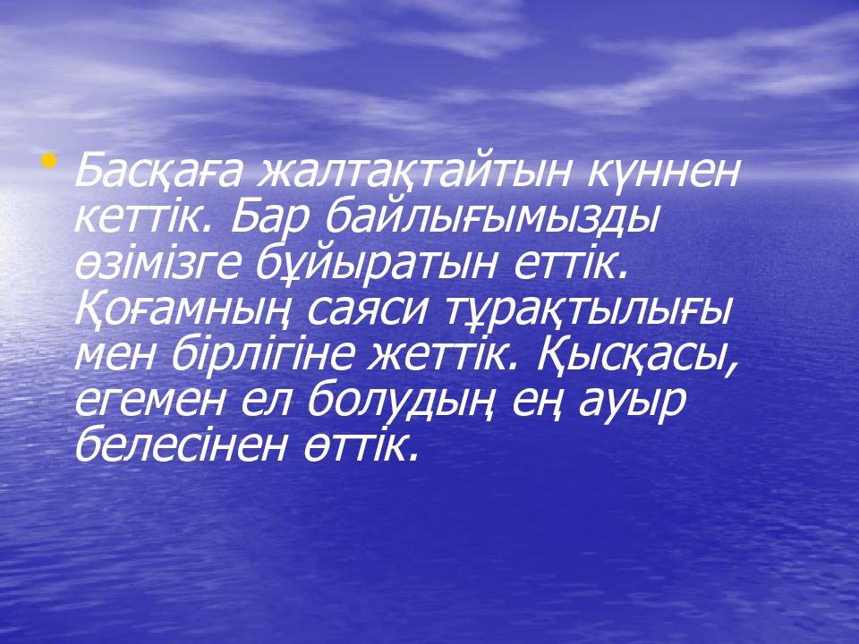 Басқаға жалтақтайтын күннен кеттік. Бар байлығымызды өзімізге бұйыратын еттік. Қоғамның саяси тұрақтылығы мен бірлігіне жеттік. Қысқасы, егемен ел болудың ең ауыр белесінен өттік.
