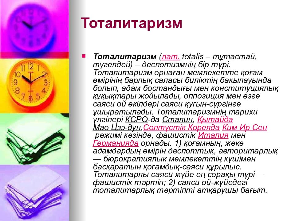 Тоталитаризм ( лат. totalіs – тұтастай, түгелдей) – деспотизмнің бір түрі. Тоталитаризм орнаған мемлекетте қоғам өмірінің барлық саласы биліктің бақылауында болып, адам бостандығы мен конституциялық құқықтары жойылады, оппозиция мен өзге саяси ой өкілдері саяси қуғын-сүргінге ұшыратылады. Тоталитаризмнің тарихи үлгілері КСРО -да Сталин, Қытайда Мао Цзэ-дун, Солтүстік Кореяда Ким Ир Сен режимі кезінде, фашистік Италия мен Германияда орнады. 1) қоғамның, жеке адамдардың өмірін деспоттық, авторитарлық — бюрократиялык мемлекеттің күшімен басқаратын қоғамдық-саяси құрылыс. Тоталитарлы саяси жүйе ең сорақы түрі — фашистік тәртіп; 2) саяси ой-жүйедегі тоталитарлық тәртіпті атқарушы бағыт.