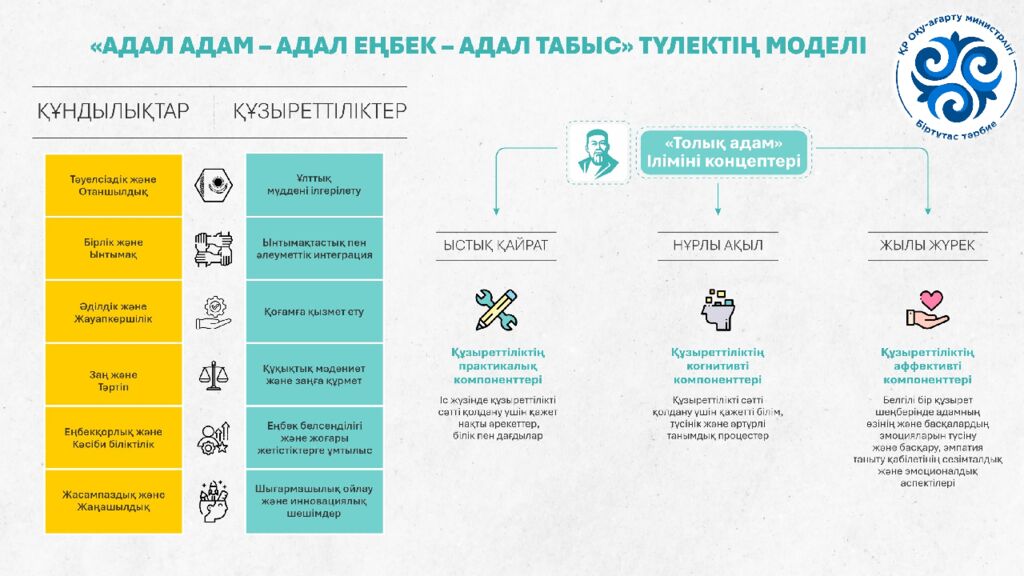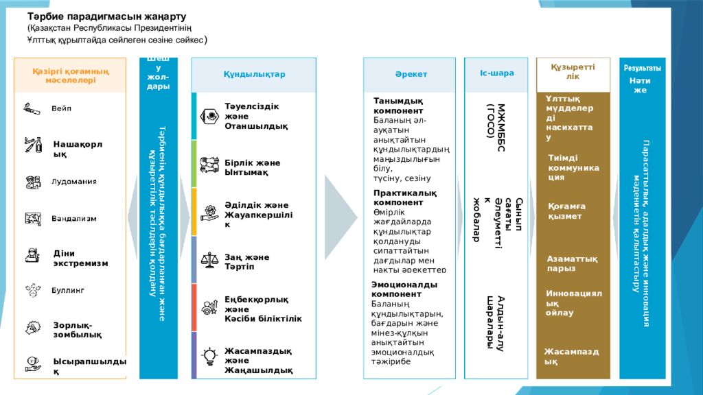Қазіргі қоғамның мәселелері Нашақорлық Діни экстремизм Зорлық-зомбылық Ысырапшылдық Тәрбие парадигмасын жаңарту ( Қазақстан Республикасы Президентінің Ұлттық құрылтайда сөйлеген сөзіне сәйкес ) Тәуелсіздік және Отаншылдық Бірлік және Ынтымақ Әділдік және Жауапкершілік Заң және Тәртіп Еңбекқорлық және Кәсіби біліктілік Жасампаздық және Жаңашылдық Құндылықтар Әрекет Іс-шара Құзыреттілік Нәтиже Шешу жол-дары Тәрбиенің құндылыққа бағдарланған және құзыреттілік тәсілдерін қолдану Танымдық компонент Баланың әл-ауқатын анықтайтын құндылықтардың маңыздылығын білу, түсіну, сезіну Практикалық компонент Өмірлік жағдайларда құндылықтар қолдануды сипаттайтын дағдылар мен нақты әрекеттер әрекеттер Эмоционалды компонент Баланың құндылықтарын, бағдарын және мінез-құлқын анықтайтын эмоционалдық тәжірибе МЖМББС (ГОСО) Сынып сағаты Әлеуметтік жобалар Алдын-алу шаралары Парасаттылық, адалдық және инновация мәдениетін қалыптастыру Ұлттық мүдделерді насихаттау Тиімді коммуникация Қоғамға қызмет Азаматтық парыз Инновациялық ойлау Жасампаздық