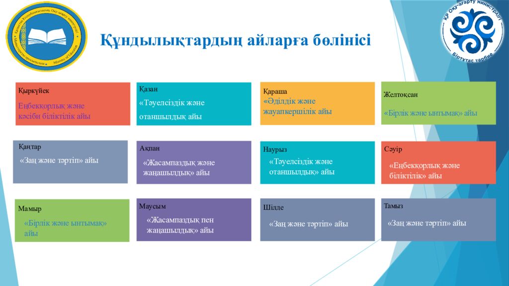 Наурыз Ма мыр Ақпан Сәуір Қыркүйек Еңбекқорлық және кәсіби біліктілік айы Қараша « Әділдік және жауапкершілік айы Қаңтар Желтоқсан « Бірлік және ынтымақ» айы Қазан «Тәуелсіздік және отаншылдық айы Маусым Шілде Тамыз «Заң және тәртіп» айы «Жасампаздық және жаңашылдық» айы «Жасампаздық пен жаңашылдық» айы «Еңбекқорлық және біліктілік» айы «Заң және тәртіп» айы «Тәуелсіздік және отаншылдық» айы «Заң және тәртіп» айы «Бірлік және ынтымақ» айы