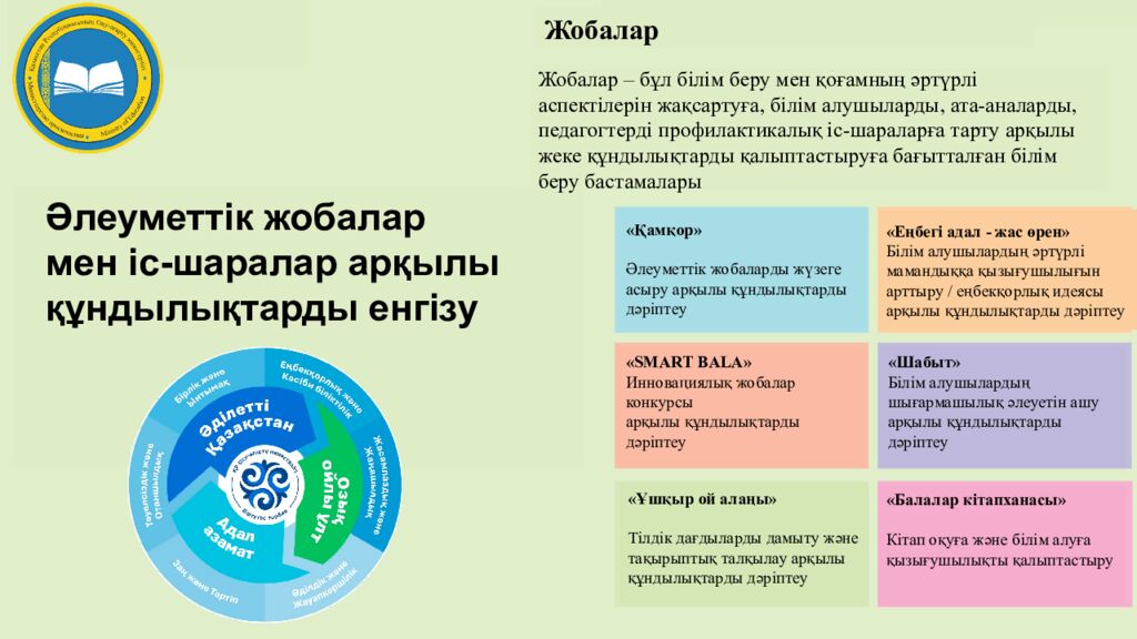 Әлеуметтік жобалар мен іс-шаралар арқылы құндылықтарды енгізу Жобалар Жобалар – бұл білім беру мен қоғамның әртүрлі аспектілерін жақсартуға, білім алушыларды, ата-аналарды, педагогтерді профилактикалық іс-шараларға тарту арқылы жеке құндылықтарды қалыптастыруға бағытталған білім беру бастамалары «Қамқор» Әлеуметтік жобаларды жүзеге асыру арқылы құндылықтарды дәріптеу «Еңбегі адал - жас өрен» Білім алушылардың әртүрлі мамандыққа қызығушылығын арттыру / еңбекқорлық идеясы арқылы құндылықтарды дәріптеу «SMART BALA» Инновациялық жобалар конкурсы арқылы құндылықтарды дәріптеу «Шабыт» Білім алушылардың шығармашылық әлеуетін ашу арқылы құндылықтарды дәріптеу «Ұшқыр ой алаңы» Тілдік дағдыларды дамыту және тақырыптық талқылау арқылы құндылықтарды дәріптеу «Балалар кітапханасы» Кітап оқуға және білім алуға қызығушылықты қалыптастыру
