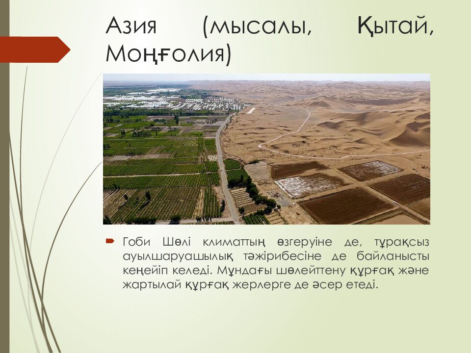 Гоби Шөлі климаттың өзгеруіне де, тұрақсыз ауылшаруашылық тәжірибесіне де байланысты кеңейіп келеді. Мұндағы шөлейттену құрғақ және жартылай құрғақ жерлерге де әсер етеді.