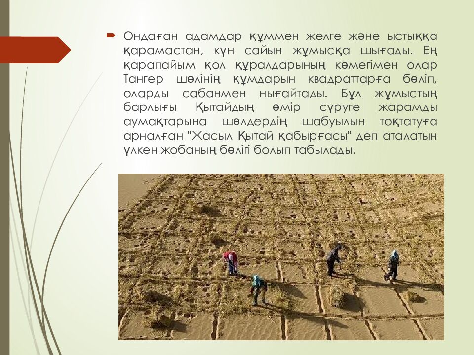 Ондаған адамдар құммен желге және ыстыққа қарамастан, күн сайын жұмысқа шығады. Ең қарапайым қол құралдарының көмегімен олар Тангер шөлінің құмдарын квадраттарға бөліп, оларды сабанмен нығайтады. Бұл жұмыстың барлығы Қытайдың өмір сүруге жарамды аумақтарына шөлдердің шабуылын тоқтатуға арналған " Жасыл Қытай қабырғасы" деп аталатын үлкен жобаның бөлігі болып табылады.
